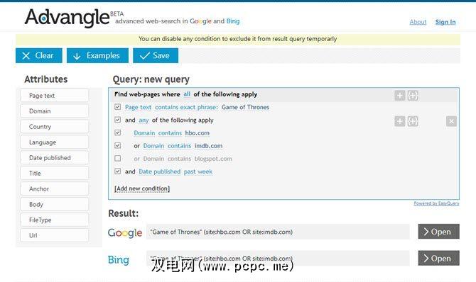 幸运的是,有一个解决方案。 Advangle [不再可用]是一种Web表单,可为您构建高级搜索查询。只需单击几下,您便可以将复杂的搜索查询组合在一起,并立即在Google或Bing中查看结果。