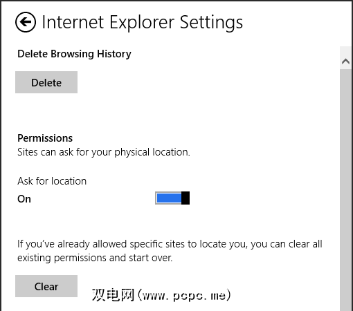 在“开始"屏幕中,启动Internet Explorer,然后点击< em> Win + C 或点击显示屏的右边缘以打开超级按钮栏。点击设置> Internet选项,然后在权限下,您会看到询问位置开关。默认设置为开,点击将禁用该功能。