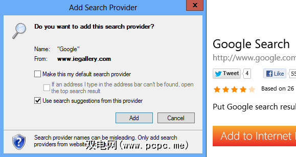 做出选择,单击添加到Internet Explorer 按钮,然后查找添加搜索提供程序对话框。选中将此设置为我的默认搜索提供程序选项,单击添加并关闭Internet Explorer。现在,两个版本都将默认设置为新的搜索工具。
