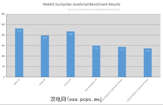 在用于比较浏览器的标准基准测试上-WebKit SunSpider-Internet Explorer 11 Release Preview仍然得分高于所有其他网站,显示页面的速度比IE10快9%,比Firefox 23,Chrome 29或Opera 16快30%。