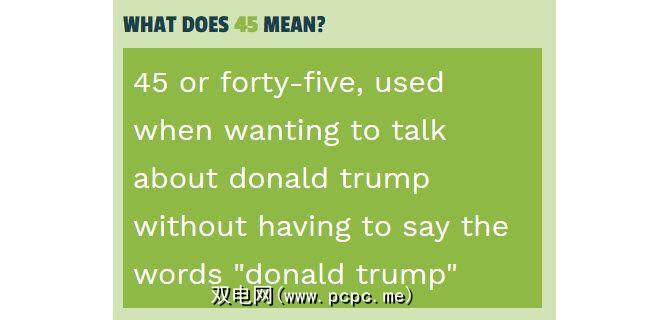 是什么意思:虽然在谈论柯尔特45武器时也可以使用“ 45",但现在它具有其他含义。根据《都市辞典》和其他消息来源,这是由 Trevor Noah的每日节目的一集引起的,Laurence Fishburne是特邀嘉宾。特朗普总统简称为“ 45"。来自Slang.org: