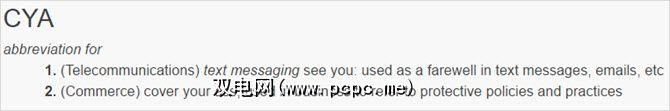这是什么意思:两种不同的用法,当有人告诉您要当心或告诉您好消息时,您可能会看到此缩写再见例如,如果同事告诉您“ CYA",那么您最好遮住屁股以避免麻烦。