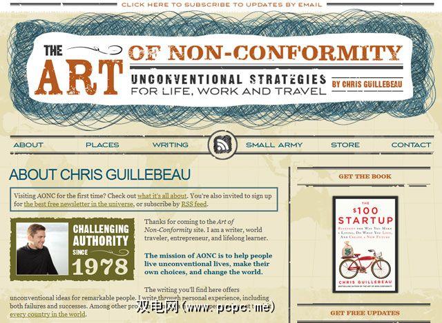 如果您已经阅读了《 The $ 100 Startup》中的非常规建议,那么您将知道Chris Guillebeau是谁。对于希望跟随自己的热情的人来说,这是一个很好的推荐读物。您会发现克里斯永久驻扎在不合格品艺术(AONC)中。他的博客不是关于个人发展,而是关于如何通过企业家精神和非常规工作实现个人里程碑。
