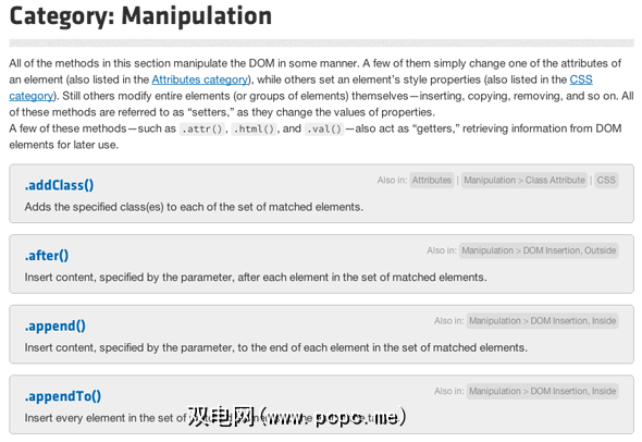 为快速回顾一下,此语句的选择器部分允许您使用类似CSS的元素名称,类或ID,以定位DOM的部分。例如,要获取所有具有 .hidden 类名的 等式的第二部分是一旦找到它们(如果它们完全存在;或者它们可能只是一个“匹配"项)就对这些DIV执行的方法。请记住,jQuery仅会 只能返回一个用于选择ID的元素,因为ID应该引用唯一的项。如果要包含多个元素,则必须将其定义为CSS中的类。 ;您可以使用还是要使用DOM吗? 首先,我上次向您介绍了 .css 方法,以便您可以将其用于测试。格式很简单: 因此,可由jQuery调整CSS定义的任何内容-颜色,透明度,位置,大小-仅举几例。更改是立即进行的。 如果您希望对CSS更改进行动画处理,那么我对您来说是个好消息;还有一种叫做 .animate()的方法。尽管有点复杂: 例如: 此时,您可能想知道花括号是什么意思;它们被称为“对象文字",通常用于创建 property:value 对的列表,如果您来自于,则类似于索引数组其他语言。您将在jQuery中使用它们很多,所以我再说一遍-习惯于正确检查是否有括号和括号! 请查看本页中有关animate方法的许多有效示例。 除了操纵CSS的属性外,您还可以使用。 text()、. html()和.val()方法来调整其内容。 (val用于表单元素的内容)。这些方法既充当 set ters,又充当 get ters;如果您未指定值,则它们将获得当前值。如果确实指定一个值,它们将替换当前值。 下面是一些简单的示例: 在注释表单中获取名称字段的当前值并将其分配给变量 comment_name : 将的值设置为从 commenter_name 获取的值: 然后,我们提供了多种方法来克隆,移动,插入或删除DOM的各个部分。 比方说,您想在content列中的每个第3段之后动态插入一个广告图像块,但是您正在用Javascript进行操作,以便可以初始加载页面保持清洁。听起来很复杂,对吧?几乎没有…… 简而言之,我们要求jQuery: 我无法在此处列出所有方法,并且您也不想阅读。关键是,有一种方法可以做很多事情,只要涉及到操纵就可以想到,因此请检查您可以使用的API。 此外,请记住,可能还有更多方法可以使用而不是一种做某事的方式。例如,如果您不能将正确的对象缩小到 insertAfter(),也许考虑考虑找到 next 子对象并使用 insertBefore() 今天最后,让我们快速介绍一下方法链接,基本上只是因为它很棒。首先,让我们考虑以下代码行: 听起来足够合理,对吧?但是,您可以在一行中执行相同的操作: 这完全相同,并且称为方法链接。由于几乎所有的jQuery方法本身都会返回一个jQuery对象,因此每个方法都可以馈入下一个。这意味着更少的代码-这总是一件好事-但它实际上也运行得更快。 为什么?嗯,每次您调用基本的jQuery $ 命令和选择器时,您都要求它在DOM树中进行搜索以查找匹配的元素。当您链接方法时,您无需再继续引用DOM,因为它知道它们现在在哪里,并且可以立即执行该方法。 今天就是这样,我认为我们可能涵盖了很多。现在,您应该具备执行一些非常繁重的DOM操作的能力,因此,可以将您的方法链接在一起,并真正弄乱页面。现在,您需要将脚本放置在页脚中,以便为页面的其余部分提供加载时间。下周我们将解决仅当所有事件都正确加载事件以及匿名函数的奇怪情况时才使jQuery做事的问题。