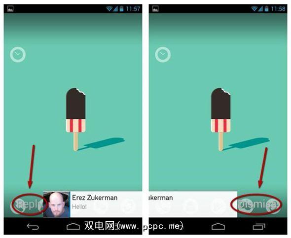 由于我的墙纸和图标的颜色,在屏幕截图中很难看到,但是向左或向右滑动通知会显示两个不同的动作:回复和解雇。向右滑动通知以打开Invi并进行回复,或者向左滑动通知以将其暂时关闭。