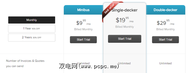 Invoicebus不会提供超过演示版的免费使用和30天的试用期(无需信用卡)。批量购买一两年时,可以享受每月可负担的费用折扣(一年折扣16%,两年折扣30%)。