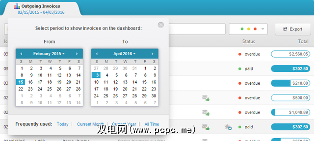 在去向发票仪表板中,您可以查看所有发票及其状态(即过期,已付款,未付款)。键入时,顶部的搜索框会立即按编号,客户或描述过滤发票结果。搜索框右侧的下拉菜单可以按发票状态进行过滤。单击日期以选择要显示发票的日期,然后单击``寄出的发票''下的日期,然后快速查看今天,当前月份或年份或所有时间发送的发票。