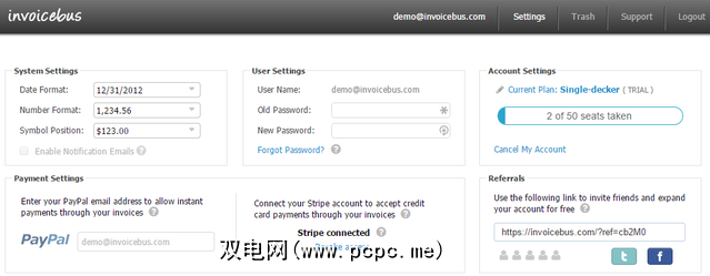 对于帐户设置,只需单击同一黑色栏中的设置。在这里,您可以调整系统设置,例如日期和数字格式,用户设置,当前计划,付款设置,甚至可以推荐朋友免费扩展您的帐户功能。