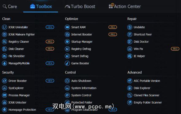 此处可访问的功能数量惊人,IObit利用其许多实用程序来添加更多功能到软件。像Uninstaller这样的功能实际上是单独的程序,如果需要的话,您可以独立安装。
