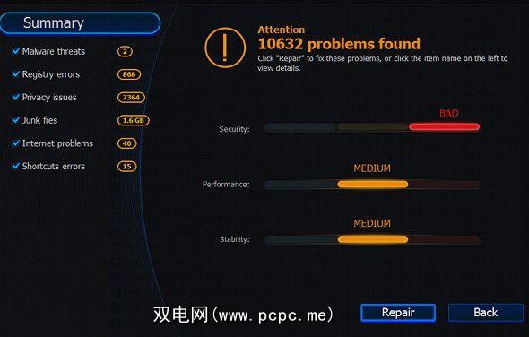 所有选择都可能引起混乱,即使对于高级用户也是如此。 。为了解决这个问题,IObit将大量的维修实用程序简化为一个大的,位于程序主菜单上显眼的“扫描"按钮。该按钮可查找对恶意软件,注册表错误,垃圾文件,快捷方式损坏和其他一些潜在问题的扫描。