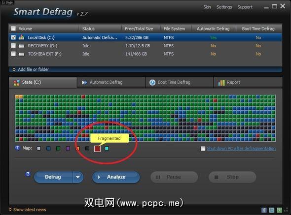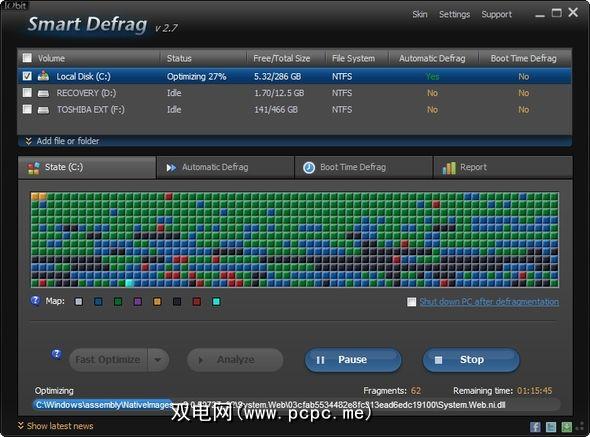 您还可以在该选项卡中使用以下按钮控制碎片整理过程: Defrag , Analyze , 暂停和停止。除碎片整理外, Defrag 上的下拉菜单还包含用于进行快速优化或完全优化的选项。根据IObit: