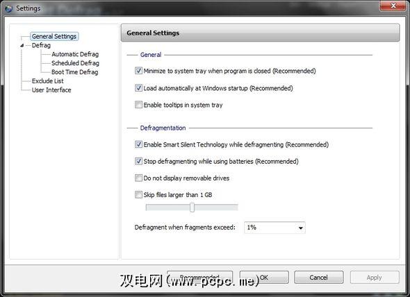 有关碎片整理的选项包括启用 Smart Silent Technology ,使用电池(对笔记本电脑有用)运行时停止碎片整理过程以及不显示可移动驱动器。