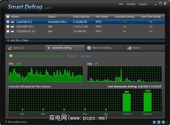 自动碎片整理的工作原理是在PC空闲时对文件系统进行碎片整理。在此选项卡中,您可以为每个驱动器将其打开或关闭。您还可以查看CPU和磁盘使用情况的实时图表,以及自动进行碎片整理的文件的统计信息。