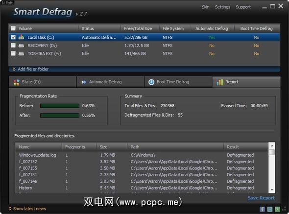 Report 中的是碎片率的前后;摘要–所有碎片整理的文件和目录,以及经过的时间;以及所有已碎片整理的文件和目录的详细列表。您还可以将报告另存为文本文件,以备日后参考。