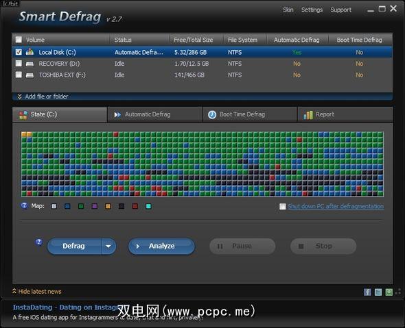 您应注意,由于Smart Defrag是免费的,因此它的底部还包含一个广告横幅。幸运的是,它不是侵入性的或令人讨厌的。实际上,它甚至使用与程序其余部分相同的主题。只需点击“ 隐藏最新新闻"链接即可隐藏广告横幅。