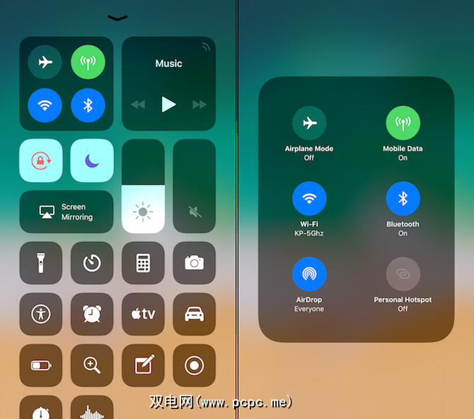 最后一个切换是iOS 11的新功能:个人热点。点击它可以快速启用网络共享功能。