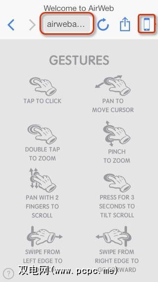 上面的屏幕快照中的通知AirWeb包含方便的网页手指手势。应用程序首页上的灰色区域用作触摸板,用于在屏幕上移动光标和浏览网页。用两根手指上下滚动网页,甚至最好在页面上按下约三秒钟以启用倾斜滚动,这意味着您可以通过上下倾斜iOS设备来滚动页面。滚动和导航不像在计算机上那样流畅,但是非常易于管理。