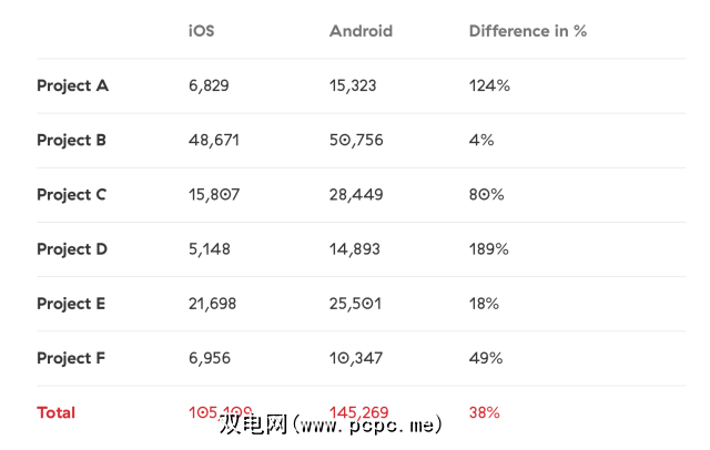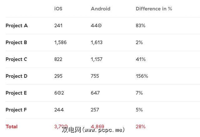 同样,您可以在此处看到明显的差异。平均而言,Android应用程序的开发时间比iOS应用程序多大约28%。