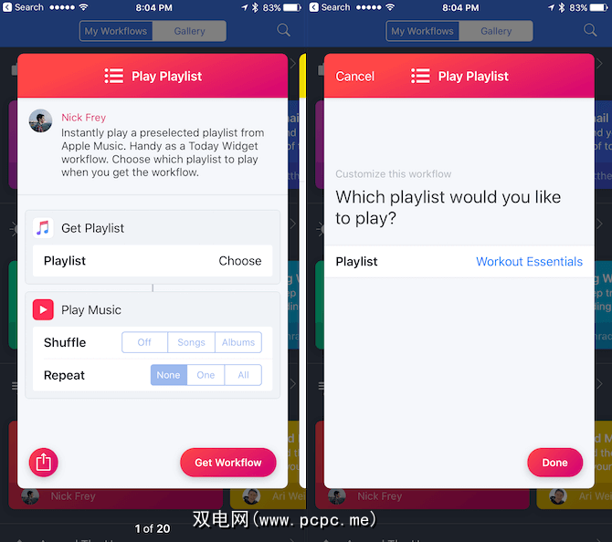 您可能不是Beats 1人,但是您可以使用类似的小部件快捷方式来开始播放您选择的播放列表。当您准备锻炼或开始上下班通勤时,这非常方便。设置工作流程时,系统会要求您选择要启动的播放列表。您可以复制此工作流程来为不同的播放列表创建快捷方式。