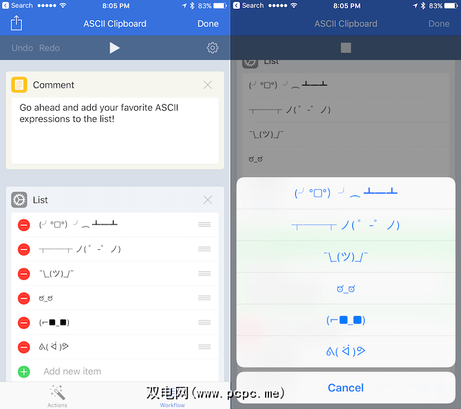 您不需要下载整个应用程序,因此始终可以方便地使用表格翻转图释。此工作流程会在主屏幕上创建一个快捷方式,该快捷方式为您提供了一个ASCII图释列表,您可以将其快速复制到剪贴板。