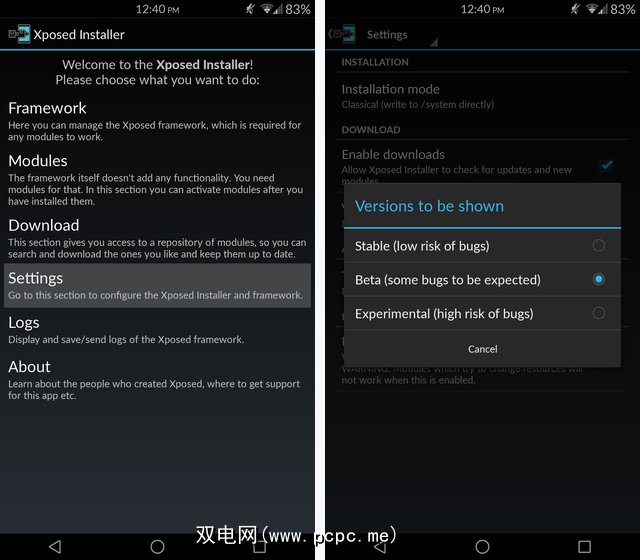 现在已安装Xposed,请从您的应用程序中打开它。抽屉,就像常规应用一样,然后导航至“设置"。由于Tinted Status Bar在技术上仍处于Beta版,因此您需要告诉Xposed显示Beta模块以及Stable模块。如果您感到特别好奇,甚至可以选择进行实验版本。