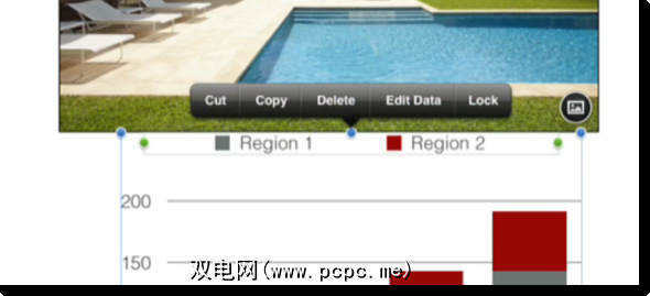 添加到文档中的所有元素都可以使用蓝色手柄移动和调整大小。轻触元素会弹出一个方便的工具栏,用于剪切,复制,删除锁定和编辑数据。您要添加到Pages文档中的任何图像都必须已经在设备的照片库中。