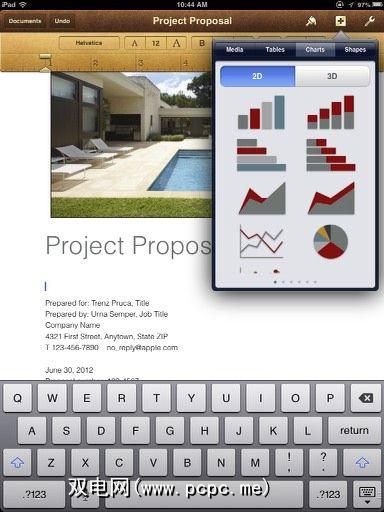 Pages还包括用于添加图像的桌面发布工具,表格(具有十二种预设布局),2-D和3-D图表以及一些可自定义的形状。