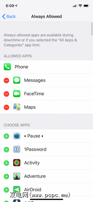 停机是最重要的选择。使用此功能,您可以安排一个时间段,其中iPhone上几乎每个应用程序都将被禁用。默认情况下,仅允许电话和电话,消息,FaceTime和地图等应用程序。
