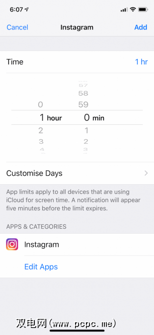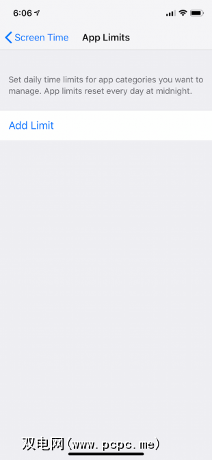 这是新的“应用程序限制"功能所在的地方。有两种添加限制的方法。您可以转到屏幕时间中的应用限制部分,然后点击添加限制。但是在这里,您只能为社交网络或娱乐(不是应用)之类的类别创建限制。选择一个类别,点击添加,然后设置时间。