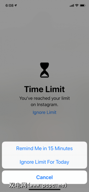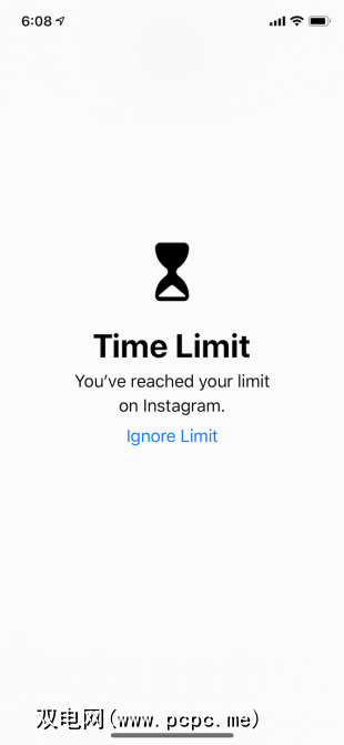 当限制增加时,相关应用将在主屏幕上显示为灰色,您会看到应用名称旁边的沙漏图标。当您点击它时,iOS会显示一个初始屏幕,提示您已达到当天的时间限制。您可以点击忽略限制按钮,然后暂停该功能15分钟,或者在一天中完全禁用该功能。