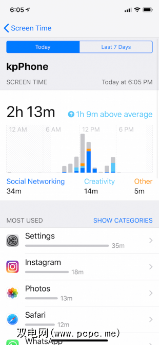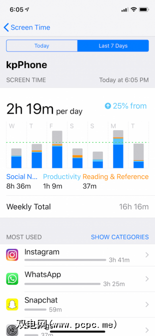 总花费时间显示在顶部,并显示时间图表iPhone处于活动状态的时间段。使用情况按社交网络,生产力,娱乐,阅读与参考等类别细分。<