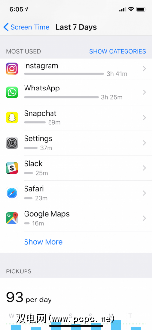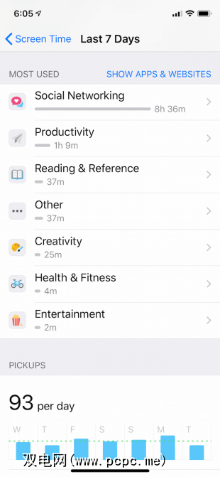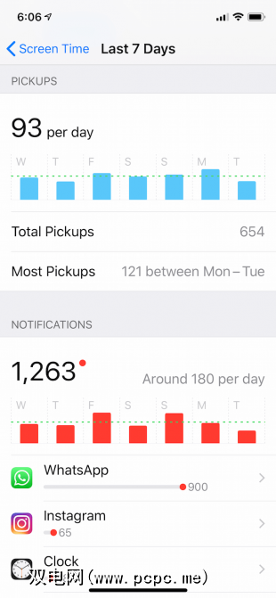 在屏幕时间上进一步向下滚动屏幕上,您将看到另外两个部分:提取和通知。 提取部分告诉您在一天或过去一周内您提取iPhone的次数。