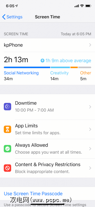 签入使用每天两天的“屏幕时间"统计信息,您将开始识别模式。这类似于“量化自我"运动和自动健康跟踪。改进之路的第一步是知识。使用“屏幕时间"统计信息可累积有关设备使用方式的知识,例如周末哪些应用程序占用您过多的时间。