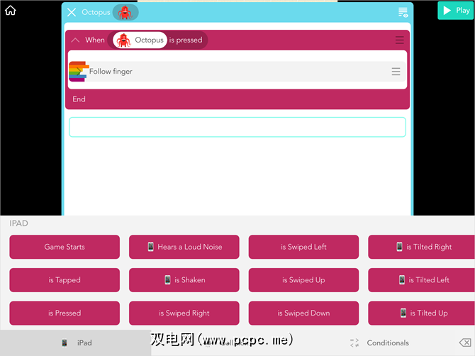 此外,您可以在放置说明后以书面和可视形式的组合查看代码。例如,如果您使章鱼在屏幕上移动手指,您将看到代码为“按下章鱼时,跟随手指。"这将为您提供单词和该字符的图片。