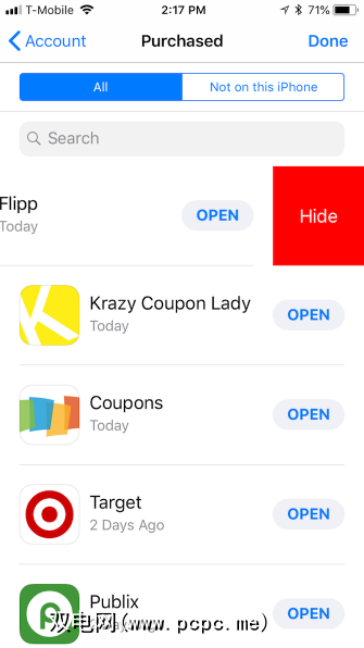 要隐藏购买历史记录中的任何内容,向左滑动即可看到红色的隐藏按钮。隐藏应用程序后,除非您在“应用程序商店设置"中取消隐藏它,否则您将无法在购买历史中看到它。