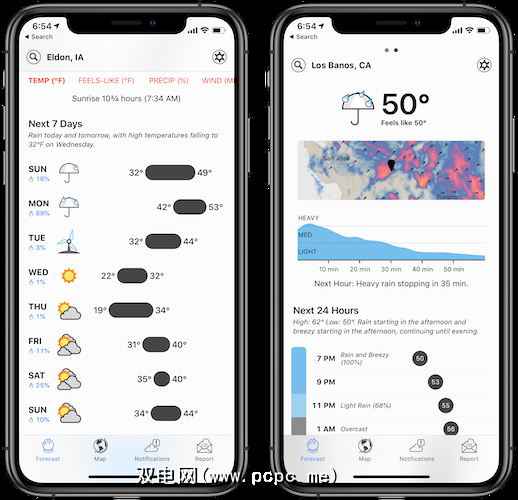 默认的Weather应用程序会告诉您当天的天气情况,而Dark Sky会按分钟提供天气预报。它可以告诉您是要在六分钟内开始下雨,还是只有几小时才能保持晴空。