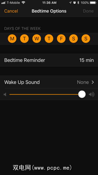 上床时间很简单。使用转盘设置您的就寝时间和唤醒时间。点按左上角的选项,以选择一周中的哪几天才能开始就寝时间,就寝时间提醒(以15分钟为增量,最多一个小时), 唤醒声音(又称为警报)和音量。