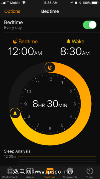 就寝时间采用了另一种方法来设置警报。首先,点击“时钟"应用屏幕底部的 Bedtime 标签,然后启用 Bedtime 滑块以打开该功能。