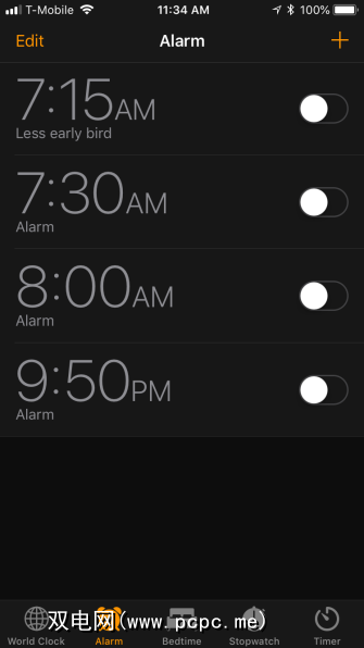 设置闹钟很简单,只需打开“时钟"应用并点击底部的 Alarm 标签。点击右上角的加按钮添加警报并旋转轮子以设置警报时间。