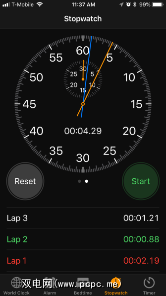 其操作与您期望的秒表一样简单(使用开始,停止和重置按钮)。它也可以跟踪圈速,并以绿色记录您最快的圈速,以红色记录您最慢的圈速。