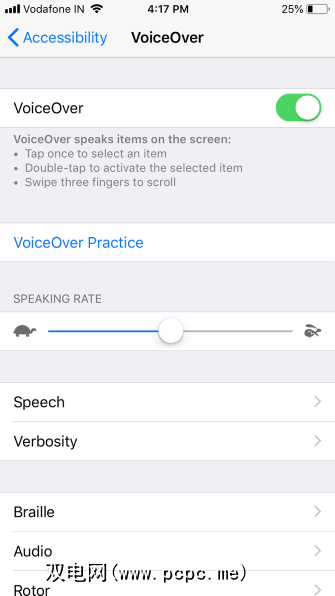 VoiceOver ,可通过读取屏幕上的菜单元素来帮助您。您可以在屏幕上的任意位置单击以激活它,从而使其对视力障碍者有用。此外,您可以微调VoiceOver选项以选择各种参数,例如语音,详细程度,盲文等。