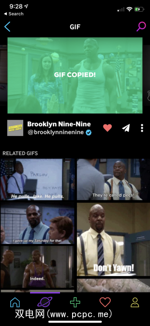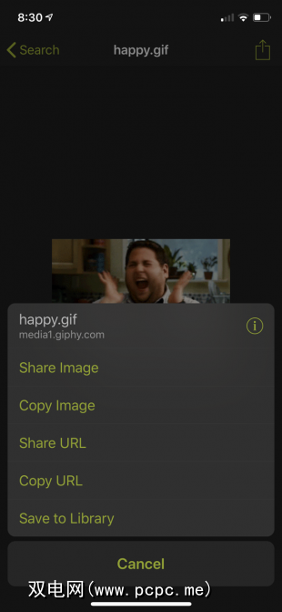 转到搜索标签以搜索GIF。点按一个GIF以将其选中,然后选择共享按钮将其添加到您的媒体库中。选择复制图像选项以复制GIF并将其粘贴到任何地方。