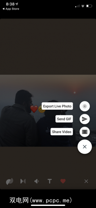 在编辑屏幕上,您可以禁用智能稳定功能,添加文本,禁用循环以及关闭音频。完成后,点击共享按钮以将其导出为GIF或视频。