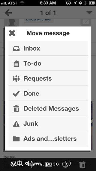 Boxer中用于处理邮件的其他选项包括将选定邮件添加到待办事项列表或将邮件简单标记为完成的功能。 。后一种选项是,用于将邮件寄存在完成列表中,以供以后查看。您还可以点击已打开邮件底部的文件夹图标,以显示Boxer的内置操作以及邮件客户端中的现有文件夹,您可以在其中将邮件移至该位置。