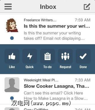 Boxer包含一些独特功能使其与其他第三方邮件客户端区分开来。首先,您实际上可以“赞"一条消息。如果要快速让发件人知道您喜欢他们的消息,只需在收件箱列表视图中向右滑动消息,然后点按“赞"图标。当您移至下一封邮件时,您的喜好回复将自动转发给发件人。