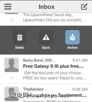 与其他第三方邮件客户端一样,Boxer包括便捷的刷卡功能。当您在收件箱列表中向左滑动消息时,默认情况下将其存档,或者您可以选择删除或将其标记为垃圾邮件。此功能的唯一缺点是您无法批量存档或删除邮件。唯一可以处理批量归档的iOS邮件客户端是Mailbox。