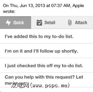 类似于Cloze,Boxer包含邮件模板,您可以快速选择这些邮件模板并将其添加到原始邮件和回复中。甚至OS X版本的Mail都不包含这些方便的代码片段。同样,您可以点击操作菜单中的“快速"图标以显示您的回复模板列表。