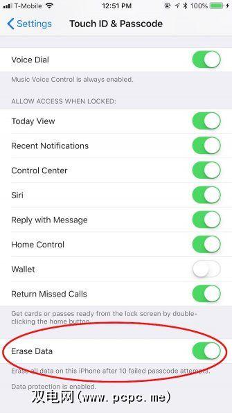 Apple提供了另一个方便的功能来增强密码。尝试10次密码失败后,将启动一个名为擦除数据的iOS设置。如果启用此功能,则如果您在设备上输入10次错误的密码,手机上的所有内容都会受到干扰。这样可以防止有人抓住您的设备并试图强行解锁它。