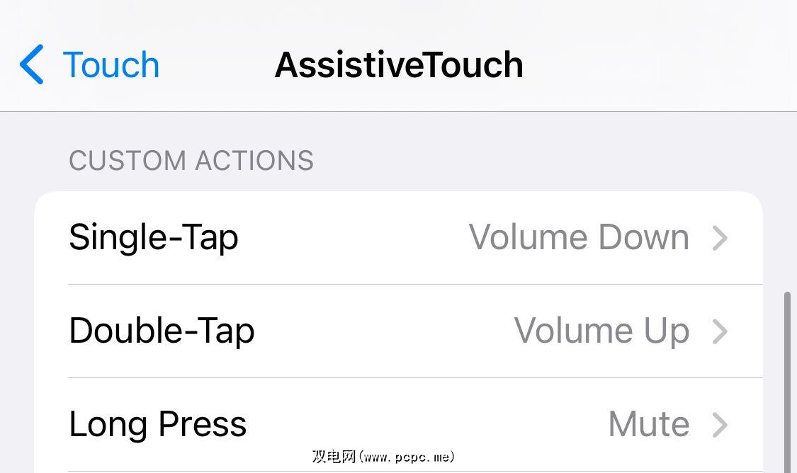 要使用它,请转到“设置” >“辅助功能” >“触摸” >“ AssistiveTouch”。在这里,您可以将设备设置为轻轻一按调低音量,然后用两次调高音量。