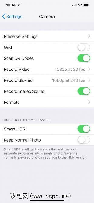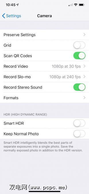 如果要默认使用Smart HDR(不必在每次拍摄照片时都将其打开),请进入设置>相机找到 Smart HDR 开关。启用此功能后,“相机"应用程序将无法使用“ HDR"选项。